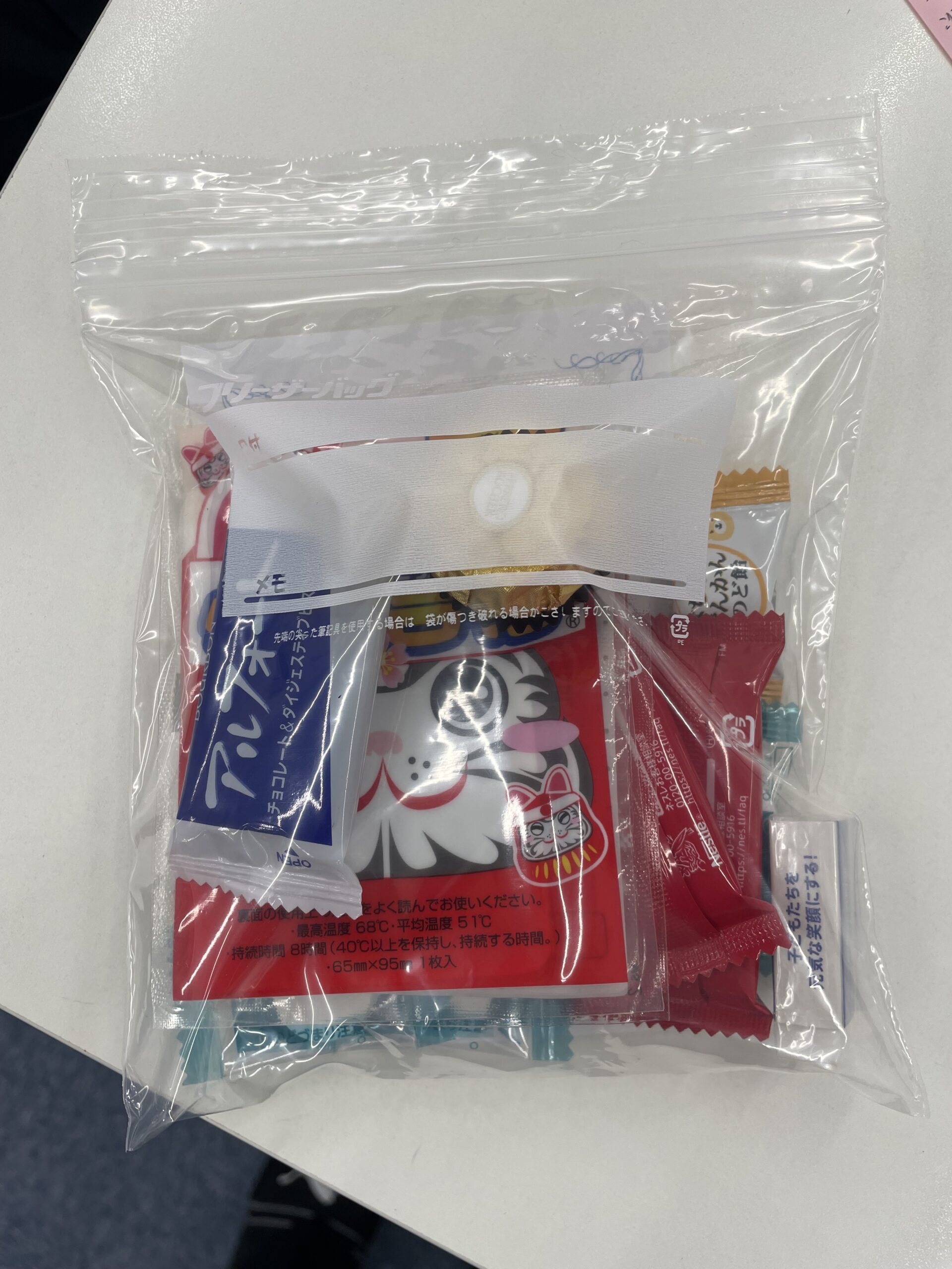 当日寒かったときのためのカイロやのど飴などなどが入っています。(アルフォートは生徒同士で交換したものです)