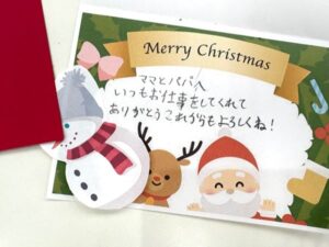 今回は、オリジナルスノードーム作りとお家の方へのクリスマスカード作成を行いました。