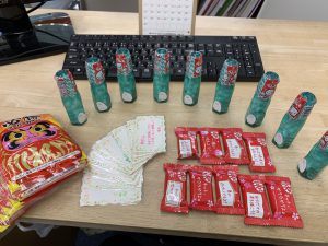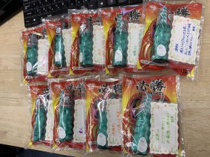 袋の中には一人ひとりに書いたメッセージカード、カイロ、キットカット、そしてラムネが入っています。
