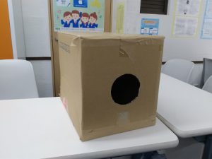 最初に段ボールでつくられた巨大空気砲から発射される空気のうず(「渦輪」)を観察しました。そこでは、飛び出すうずの形や動きなどたくさんの発見がありました!