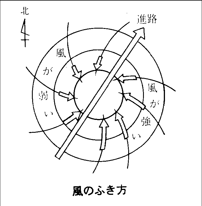 では、なぜ台風の南東側なのでしょうか? それは、「台風の進行方向と、台風に吹き込む風向きの、2つの向きが一致する」からなのです。日本にやってくる台風の進路は、北~北東の方向です。また、台風は巨大な低気圧で、その中心に向かって反時計方向に風が吹き込んできます(下図)。その2つの向きが重なり合う南側で、強い風がさらに強烈になるのです。