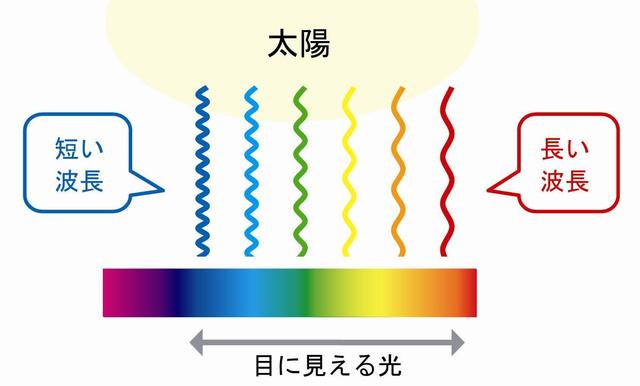 👴その光の七色は、図のように『波』として「振動」しながら進んでくるのぢゃが、色によって振動のしかたが違うんぢゃ。「赤色」の振動はゆるやかで、「青色」の振動はとてもはげしいのぢゃ。