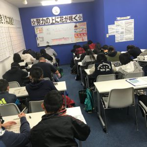 さて、中学3年生のテスト対策を8時間行ったあと、中学1・2年生のテスト攻略ガイダンスを行いました。