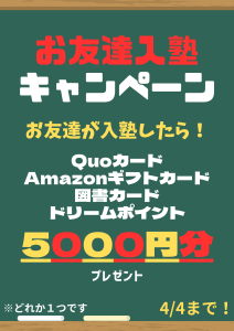 お友達入塾キャンペーンは、紹介いただいたお友達が入塾した場合に使えるキャンペーンです!