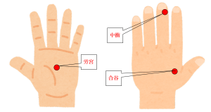 他にも中指の爪の生え際にある中衝(ちゅうしょう)や、手のひらの真ん中あたりにある労宮(ろうきゅう)があります。