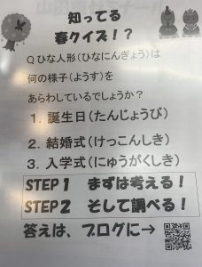 小学生 役立つ知識 【山田東ゼミ】知ってる春クイズ!? 2024年3月7日 こんにちは、山田東ゼミナールの海汐です! 今日小学校の校門で配っていた、クイズの答えをお伝えします。 答えは!!!!!!!!!!! 2 結婚式(けっこんしき)です! ひな人形は「将来、良い結婚ができますように。」と願いを込めたもので、おひなさまは結婚式の場面を表したものです。 みなさんのお家には、ひな人形はありましたか? 山田東ゼミナールでは、このような役に立つクイズを教えていきます~! 山田東ゼミナール 塾長 海汐直美 06-6876-2511 yh-info@dr-t-eam.jp