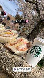 桜の花を見て飲むコーヒーと食べるサンドウィッチ