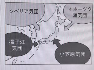 👨冬から夏にかけてなので、「シベリア気団」と「小笠原気団」のぶつかり合いと思われがちぢゃが、雨がよく降るので湿り気の多い気団どうし、つまり「オホーツク海気団」と「小笠原気団」のぶつかり合いでできる前線によるものなのぢゃ。試験によく出るので、ちゃ~んと覚えておくんぢゃぞ!