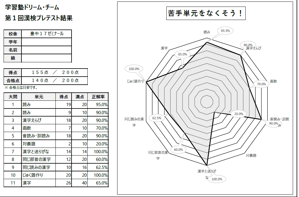 プレテスト時の結果から帳票を作成して苦手内容がひと目で分かるようにしました。