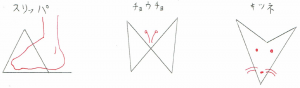 形がまさに「スリッパ」「チョウチョ」「キツネ」に似ていますね。