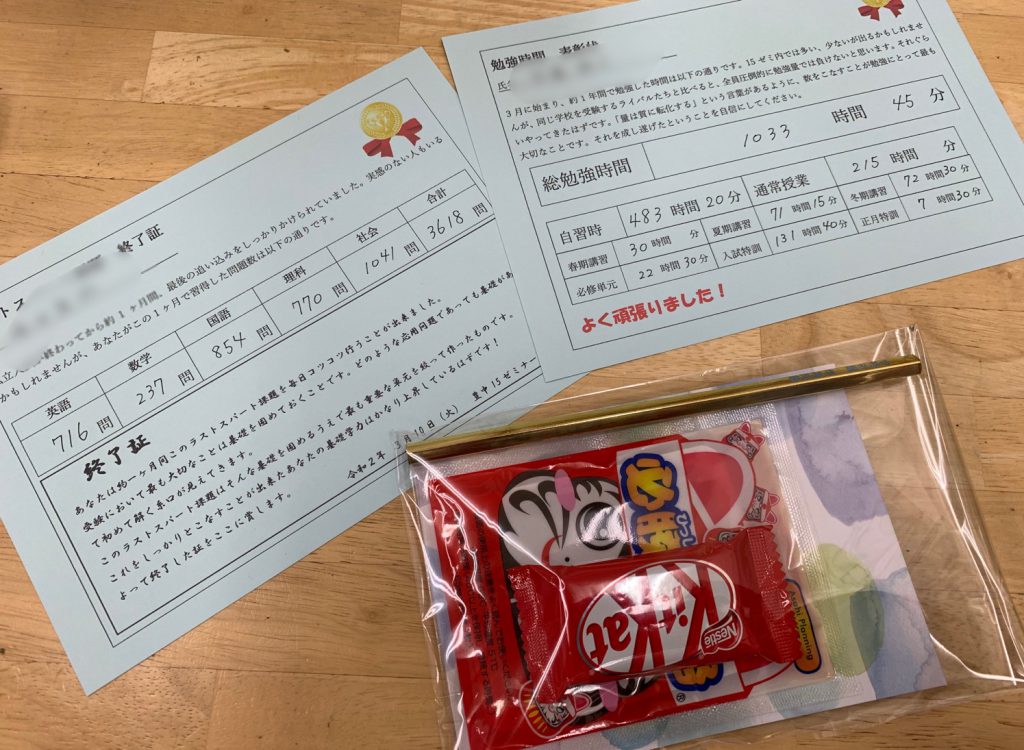 この1年間でどれだけの時間勉強に取り組んだのかと、最後に課したラストスパートマラソンで取り組んだ問題数を表彰しています。